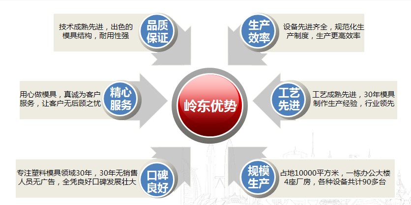 揭陽嶺東模具有限公司創(chuàng)建于1986年,歷時20多年穩(wěn)健發(fā)展,廠區(qū)占地面積5000平方米,是一個技術(shù)力量雄厚、設(shè)備先進、工人經(jīng)驗豐富的民營塑料模具制造企業(yè)。公司擁有寬敞明亮的現(xiàn)代化標(biāo)準(zhǔn)廠房及各種先進的加工設(shè)備,其中日本哈馬伊加工中心、中國臺灣省加工中心、大型龍門銑床及各種立式、臥式數(shù)控銑床共31臺,數(shù)控車床15臺,數(shù)控線切割機、數(shù)控電火花成型機、鉆床、磨床及鋸床共計32臺,大小型起重機、航車15臺。自主研發(fā)模具生產(chǎn)工藝及模具成型技術(shù),特別對于制造加工大中型日用塑料模具具有極大優(yōu)勢。